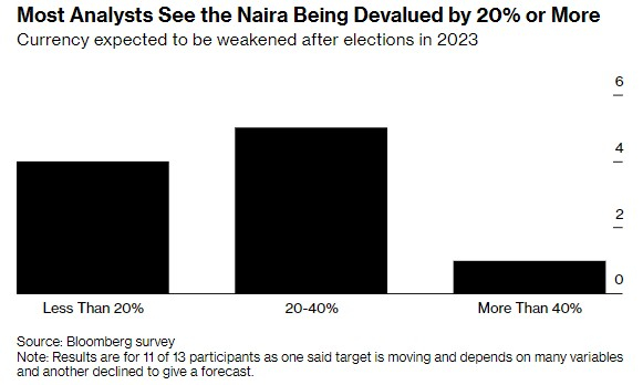 接受调查的13名投资者和分析师中,11人预计尼日利亚中央银行将在选举后让奈拉贬值。其余两位分析师预计,奈拉将继续逐步贬值。自去年采用更灵活的NAFEX(投资者与出口商汇率)以来,奈拉开始逐步贬值。