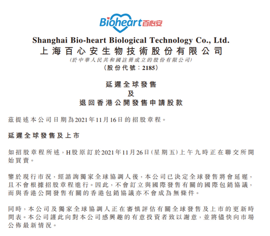 11月22日,百心安-B在港交所发布公告称,鉴于现行市况,经咨询独家全球协调人后,本公司已决定全球发售将会延迟,且不会根据招股章程进行。因此,不会订立与国际发售有关的国际包销协议,而与香港公开发售有关的香港包销协议亦不会成为无条件。