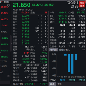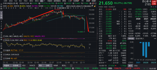 11月18日消息,百心安盘中一度暴跌近70%,低见15.46港元,市值蒸发65亿港元,最新市值只有53亿港元。