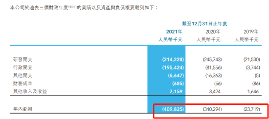 值得注意的是,公司目前没有任何产品获批商业化,因此尚未产生收入。2019年、2020年及2021年,公司亏损分别为人民币2372万元、3.4亿元及4.1亿元,三年亏损7.6亿,2022年中期再度亏损1.16亿,2019年以来累计亏损8.8亿。