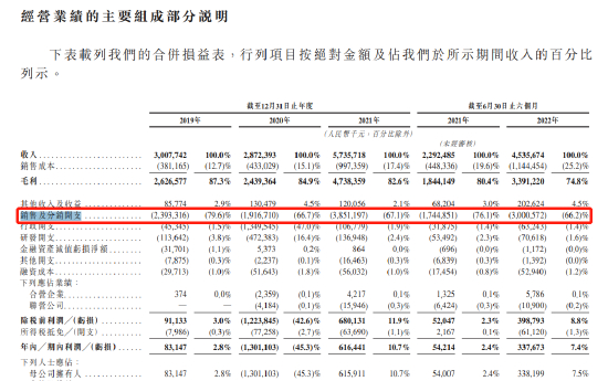 于2019年、2020年 及2021年以及截至2021年及2022年6月30日止六个月,公司销售费用占收入的比重分别达79.6%、66.7%,67.6%及66.2%。同期,公司净利润率仅为2.8%、-45.3%、10.7%及7.5%。