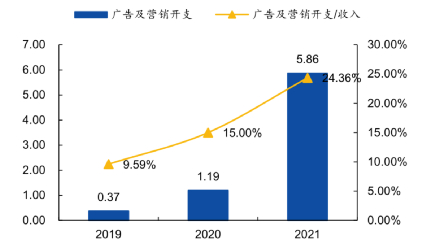 2019年至2021年,蕉下的广告和营销费用,分别占营收9.6%、15.0%和 24.4%。