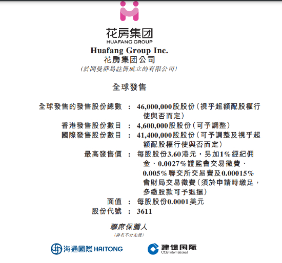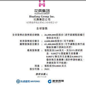 周鸿祎旗下花房集团发布全球发售公告,公司拟全球发售4600万股股份,香港发售占比10%,国际配售90%,股票代码3611,入场费3636.29港元,招股区间2.8至3.6港元,公司拟12月12日上市,不过,公司未引入基石投资者。
