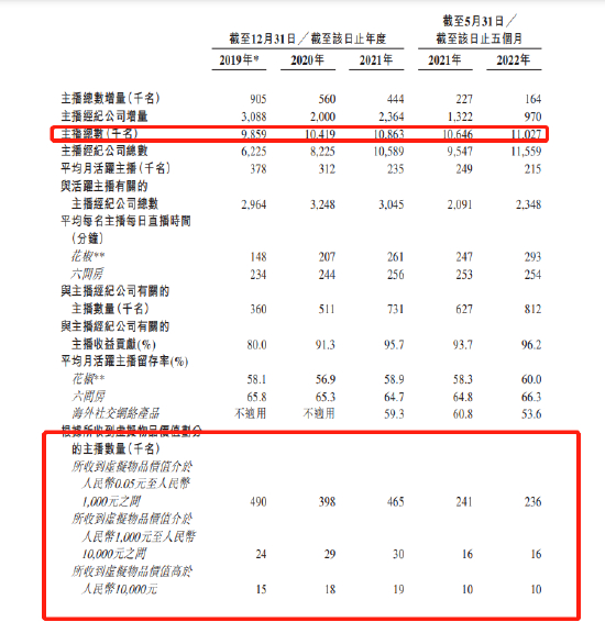 同期,来自前十大主播的收益合共分别为2.03亿元、3.37亿元、人民币4.22亿元及3.63亿元,分别占收益总额的7.2%、9.1%、9.2%及17.4%。