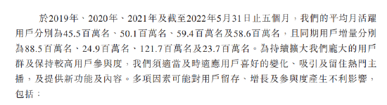 奶糖主要针对音频直播,收入计入花椒,于2019年、2020年、2021年以及截至2022 年5月31日止五个月,奶糖产生收入为0、1640万、2.17亿元、4780万元及1.14亿元,分别占同期花椒产生的收益 的零、0.6%、6.3%、3.5%及7.6%。