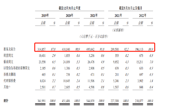 虽然主播增量下滑,活跃度显出颓势,但公司销售及营销开支持续增大,而广告开支则是占比最大的开支,2019年至2022年前5个月分别支出3.15亿、4.1亿、4.96亿以及1.96亿,三年半不到广告支出了14亿。