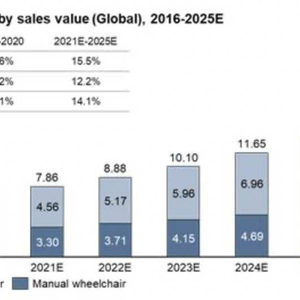 全球整体市场发展方面,2016年至2020年,轮椅总销售额从约40.7亿美元上升至约71.5亿美元,复合年增长率为16.6%。在全球下游终端用户强劲需求的推动下,到2025年底,轮椅的总销售额预计将达到约133.4亿美元,2021年至2025年的复合年增长率为14.1%。