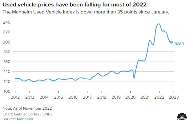 在美联储加息、新车供应增加以及对衰退的担忧等因素下,美国二手车销售下滑,二手车批发价格在11月跌至一年多来的最低水平。美国最大汽车线上线下(O2O)交易平台Cox Automotive表示,公司旗下用于衡量二手车价格变化趋势的Manheim指数(Manheim U.S. Used Vehicle Value Index)在11月跌至199.4,自2021年8月以来首次跌破200,较上年同期下降14.2%,这也是该指数连续第六个月下降。此外,该指数已较2022年1-11月期间的创纪录高点下跌了15.6%。