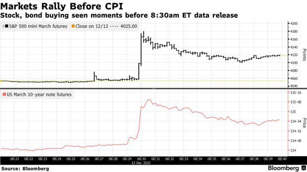 周二美国11月CPI数据公布前一分钟内,美股和美债跳涨。据传,美国11月CPI数据被泄露,导致数据公布前金融市场出现大量押注。标普500指数期货在CPI数据公布前飙升超过1%;美债买盘暴增,3月到期的10年期国债期货成交量达到13518,导致基准十年期美债收益率被推低约4个基点。在如此短的时间内出现如此大的波动、甚至比某些交易日的全天波动还要大,这引起了市场的怀疑。