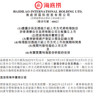 海底捞发布公告,公司建议分拆并通过介绍方式将特海股份于联交所主板上市,执行方式将为向合资格股东实物分派本公司于紧接分派完成前将有权拥有的所有特海股份。