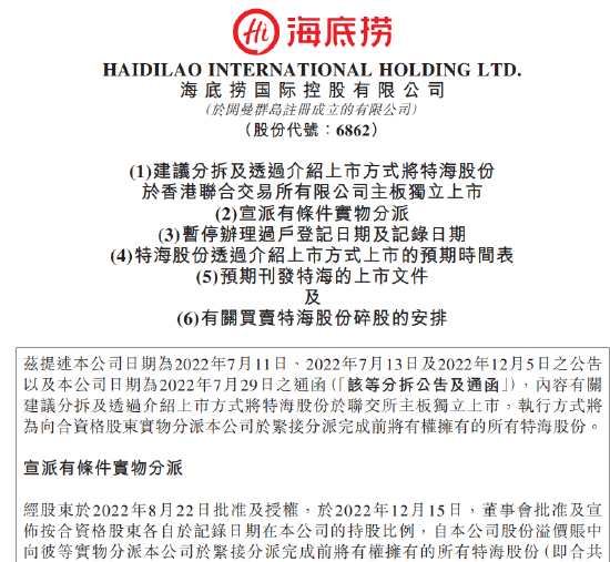 12月15日董事会批准及宣布按合资格股东持股比例,自公司股份溢价账中向彼等实物分派本公司于紧接分派完成前将有权拥有的所有特海股份(即合共5.57亿股),占当时将予发行的特海股份总数的90%。合资格股东将每10股海底捞分派1股特海股份。