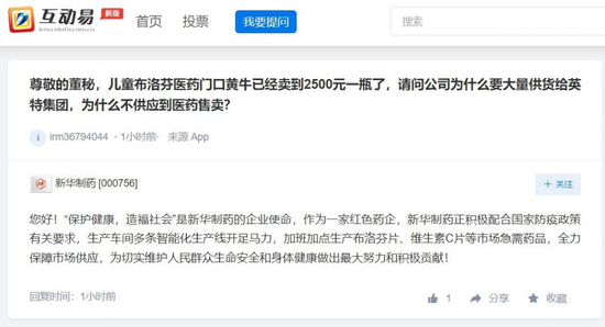 16日,有投资者在深交所互动易平台上向新华制药提问称,儿童布洛芬黄牛已经卖到2500元一瓶了,请问公司为什么要大量供货给英特集团,为什么不供应到医药售卖?