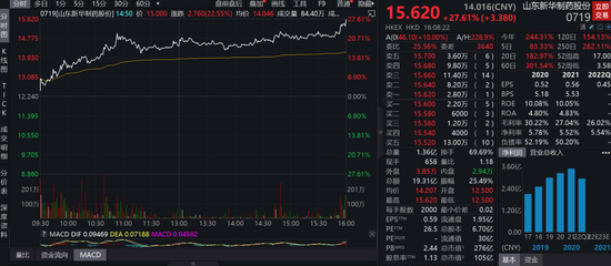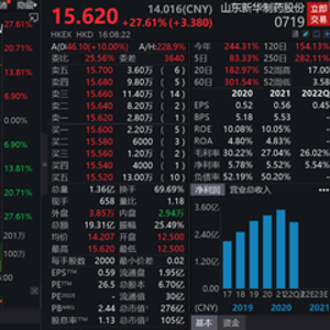 今日港股尾盘,资金疯狂抢筹新华制药,不仅突破15港元关口,而且竞价获得暴拉,有2000多万资金抢筹,将新华制药的涨幅定格在15.62港元。