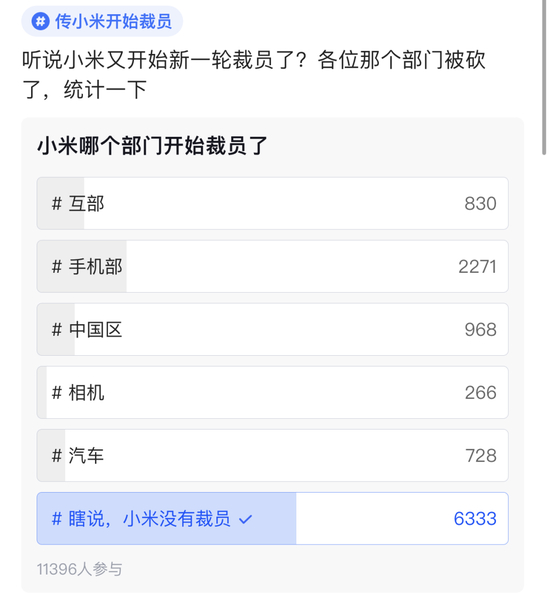 早在五天前,在脉脉上就有人对“小米裁员”进行发起了一轮投票。通过这次投票可以发现,这次小米裁员的范围非常广泛,涵盖小米的手机业务、中国区业务、相机部门,甚至是汽车业务等多个板块。此次被裁员工的名单内里不乏刚入职不久的应届大学生。