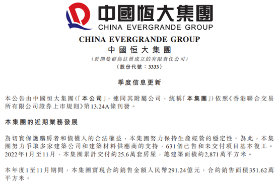 据恒大公告,2022年前11个月,恒大实现合约销售金额人民币291.24亿元,合约销售面积351.62万平方米。根据路透推算,这个销售金额只有去年上半年销售额的8%。