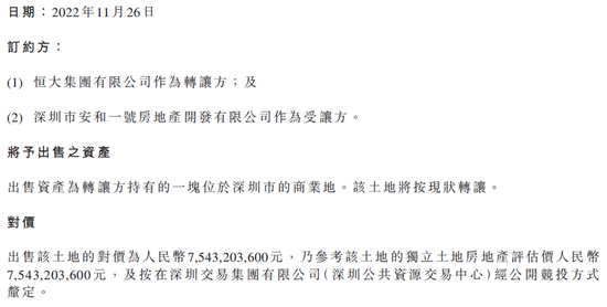 11月28日晚,恒大公告称,11月26日,深圳湾总部地块转让给深圳市安和一号房地产开发有限公司。
