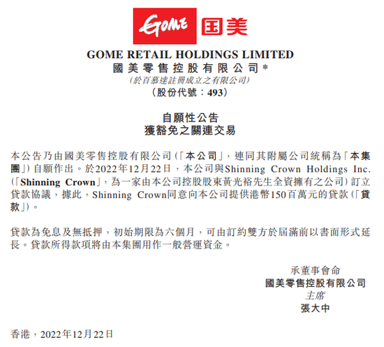 需要说明的是,Shinning Crown是黄光裕全资拥有的公司。公告显示,这笔贷款为无息、免抵押,初始期限为6个月,双方可以书面形式延长期限,贷款所得款项将用作一般运营资金。
