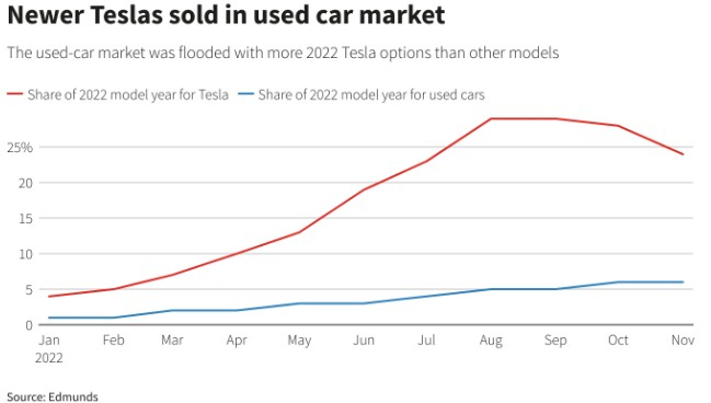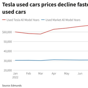 随着燃油价格逐渐趋于缓和、利率上升、特斯拉产量增加、以及新能源电动汽车行业竞争加剧,导致特斯拉二手车的价格下跌速度快于市场的平均水平,对新特斯拉价格影响也产生了连锁反应。