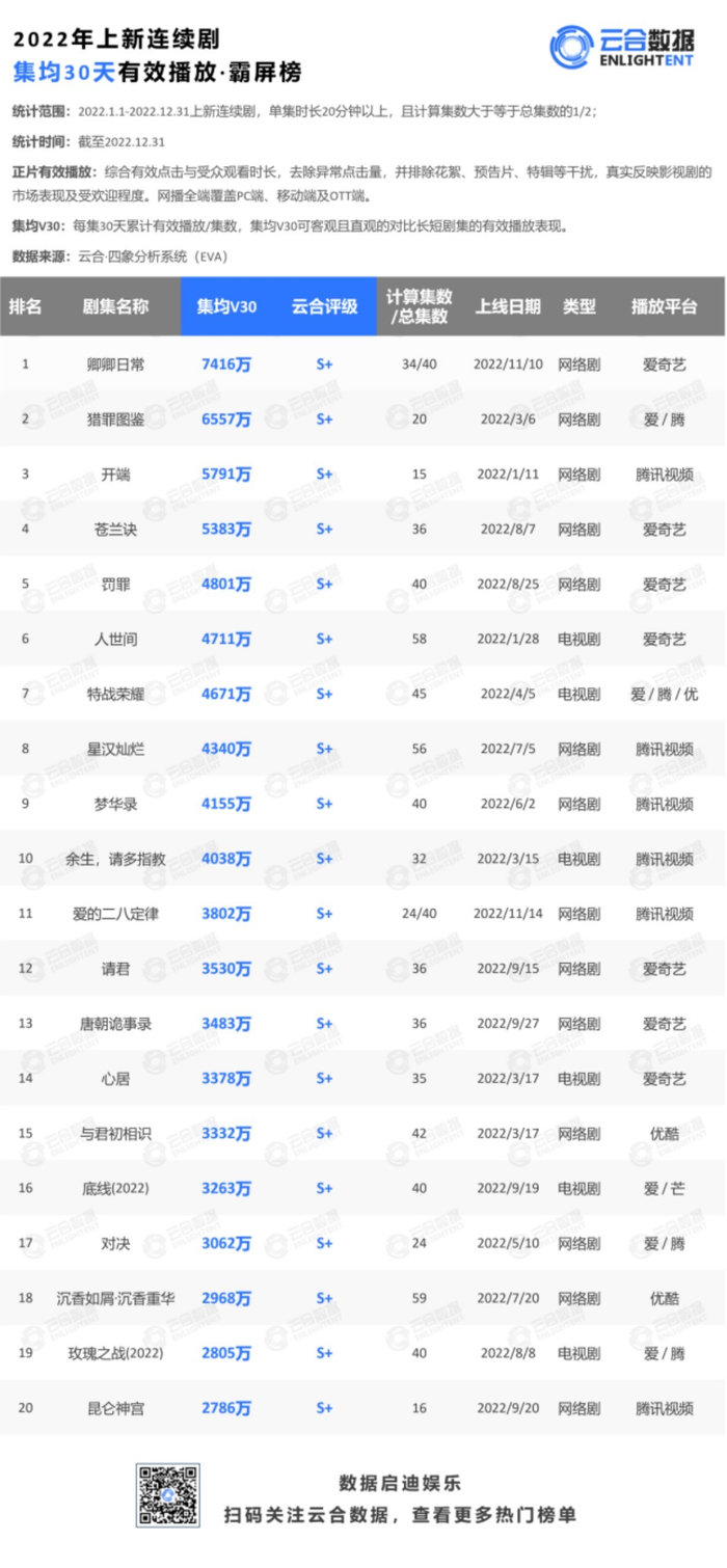 云合发布2022剧集年榜:爱奇艺断层领跑,TOP20作品数量超同业总和