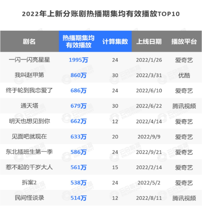 2022年上新分账剧热播期集均有效播放TOP10中,爱奇艺分账剧占7部,青春悬疑剧《一闪一闪亮星星》有效播放达1995万,位居2022年上新分账剧首位,该作品分账金额已破亿,也刷新了爱奇艺分账票房记录。