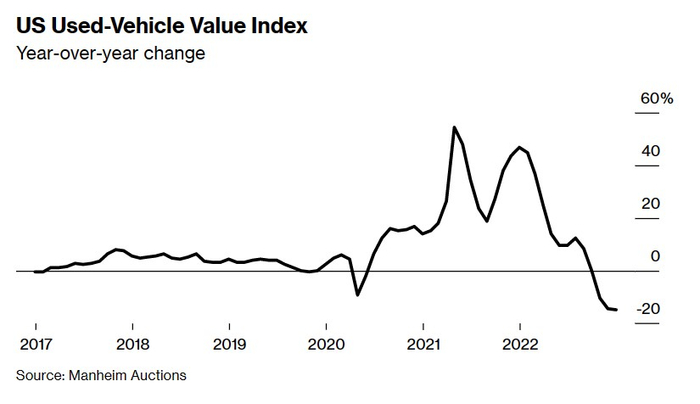 在汽车行业的任何一个领域,这些裂痕都不及二手车市场明显。二手车零售商CarMax(KMX.US)艰难度过了年底,而被视为行业颠覆者的Carvana(CVNA.US)则奋力避免破产。北美最大规模的汽车数据统计公司Manheim一直在关注二手车价值,去年12月的价格水平创下27年来的最大跌幅。而汽车制造商背后的金融公司正面临利润暴跌。