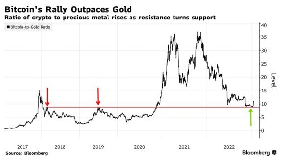 截至去年11月的12个月里,比特币与黄金的比率下降了 76%,这一情况已经逆转——至少是暂时的——在这段时间里,加密货币跌入熊市。该指标实际上在两个月前触及低点并横盘整理,并在2018年和2019年的阻力位获得支撑。2023 年迄今的上涨表明该障碍现已变成重要的支撑区域。