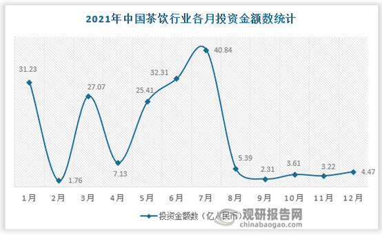 观研的报告显示,2019-2021年,茶饮行业的投资事件数量一直呈上升态势,分别有46、65、99起投资事件。2021年成为行业的“投资大年”,当年7月发生13笔投资,行业披露的投资金额达到40.84亿元。