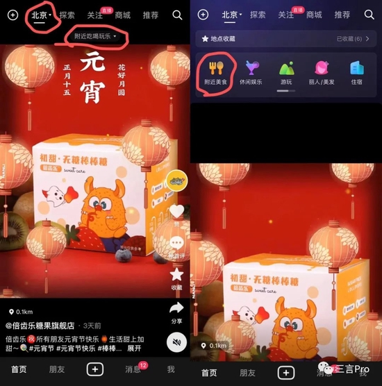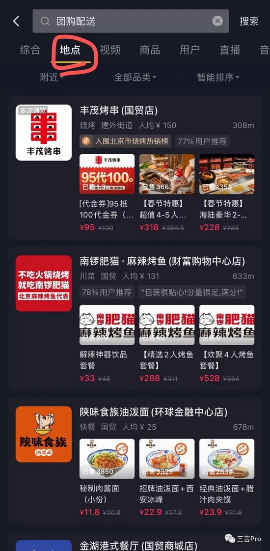 另外,还可以通过抖音中的“同城-附近吃喝玩乐-附近美食”进入提供团购配送服务商家界面。