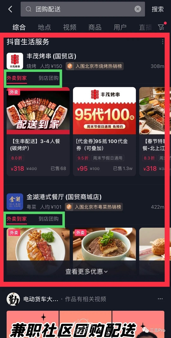 团购配送在抖音App中并没有比较明显的直接入口,用户需要手动在搜索栏中搜索“团购配送”、或者“外卖”才能体验。