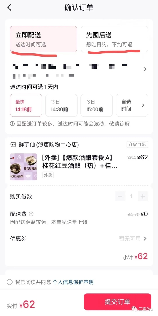 此外,抖音团购配送服务还支持“先囤后送”,如果用户不着急当日使用,可以先付款,然后等以后需要了再约配送。