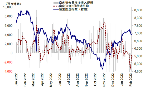 南向流入短期趋缓。2022年11月港股快速反弹以来,南向资金流入却有所放缓、甚至上周单周流出规模创2021年8月以来新高,呈现出明显获利回吐迹象。2023年以来,南向资金累计小幅流出19.6亿港元,相比2022年同期流入452亿港元以及2021年同期大幅流入3688亿港元相比体现明显弱势。流向方面,年初至今,南向资金主要流入中国移动(43.9亿港元)、商汤-W(14.9亿港元)、中海油(13.5亿港元)、先声药业(9.0亿港元)和比亚迪股份(8.4亿港元);但主要流出腾讯(97.1亿港元)、建设银行(49.8亿港元)、美团-W(32.2亿港元)、港交所(31.3亿港元)和工商银行(12.8亿港元)。
