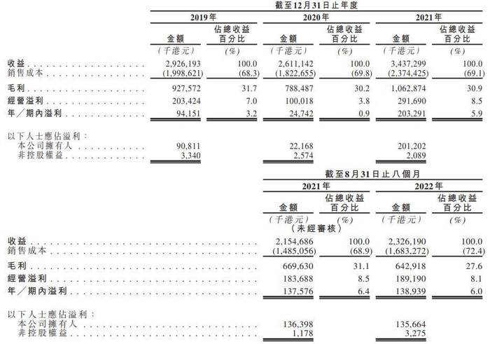 财务方面,于2019年、2020年、2021年及2021、2022年前八月,SML收益分别约为29.26亿港元、26.11亿港元、34.37亿港元及21.55亿港元、23.26亿港元。同期,年内溢利分别约为9415.1万港元、2474.2万港元、2.03亿港元及1.38亿港元、1.39亿港元。