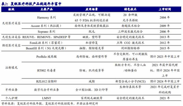 2021年公司和复星医药订立再许可协议引进、使用、销售及商业化长效肉毒素RT002,同时公司引进的注射用透明质酸钠溶液(PROFHILO)也已经正式启动有效性和安全性临床试验,注射填充业务产品管线进一步得到扩展;同年,复锐完成了对复星牙科的收购并整合了数字牙科平台;2022年公司又对瑞克布朗投资了3500万人民币,持有瑞克布朗23.2%股权。