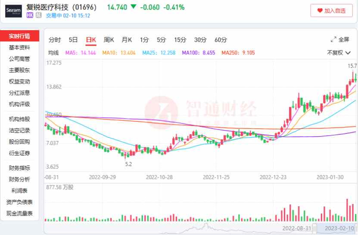智通财经观察到,作为港股能量源医美的代表,复锐医疗科技的股价自去年10月起随港股创新药械行情启动,在经历2波稳定向上走势后,随着国内防疫政策开放,其股价在12月底正式起飞,并迅速实现翻倍增长。自去年10月12日至今年2月9日的近4个月中,公司累计最高涨幅达到201.9%。