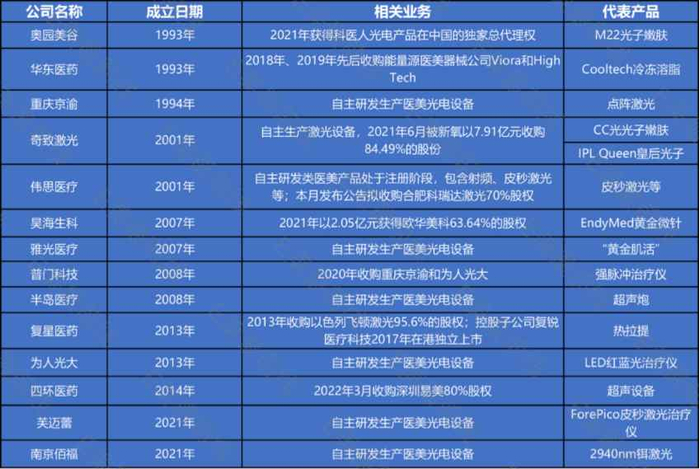 但随着光电医美赛道潜力的不断挖掘,虽然国内目前医美光电市场上的主导产品仍为进口产品,但已有十几家国产公司或以兼并购的方式,或以取得总代权的方式,或以自主研发的方式入局医美光电赛道。