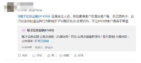 其次,本次耀才证券作为关闭内地账户的出头鸟,在社区平台舆论争议非常大,有股民表示,“ 这是在立人设,做给香港客户及潜在客户看,反正损失小,自己应该也知道这种行为影响不了监管机构,不过对内地客户真是不厚道”,还有股民表示,“这公司就该破产,完全无视客户利益….监管政策都没出居然就擅自限制存量客户交易,真是不要…”