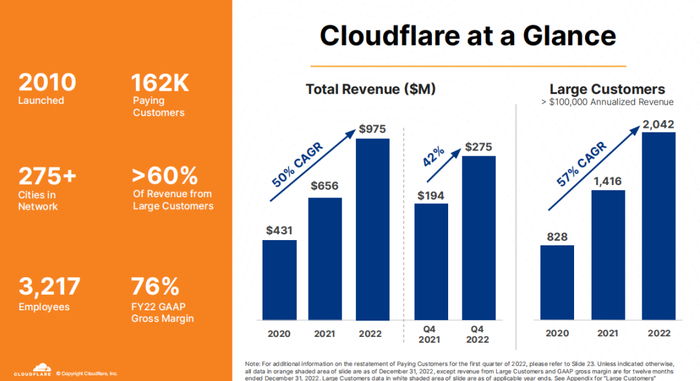 因此,当下的Cloudflare是一家技术领先,拥有高估值但也有高确定性增长的公司,而Snowflake或者英伟达,都属于这种形态的公司。