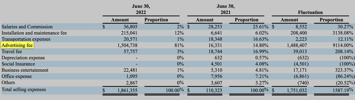 相较之下,公司的利润端显得颇为波动。柯普尼2021年的净利润同比大增47.33%至199.07万美元。但2022上半年却增收减利,净利大幅下滑94%至6.56万美元。其中2022上半年净利的下滑主要由两方面的因素导致,其一是材料及劳动力成本的大幅上涨导致毛利率下跌6.02个百分点至31.4%;其二是销售及营销开支和一般行政开支均大幅上涨,导致总运营费用大增398%至339.04万美元。据了解,2022上半年公司公司进行了一系列商业推广活动,期内广告费用增长了超9000%。此外,公司还于期内提升了对管理层及员工的福利和补偿。这都导致了运营费用的快速增长。