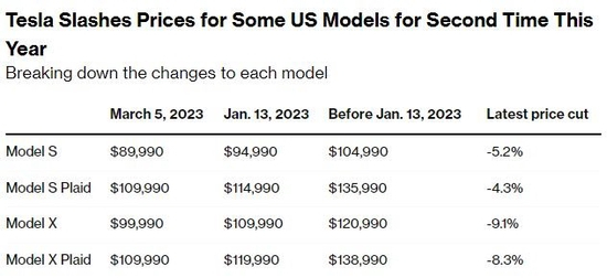 根据该公司网站的数据,Model S从94990美元降至89990美元,降价5.2%;Model S Plaid 从114990美元降至109990美元,降价4.3%。Model X 从109990美元降至99990美元,降价9.1%;Model X Plaid 从119990美元降至109990美元,降价8.3%。