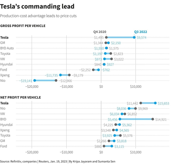 特斯拉一再降价的底气在于其超高的毛利率。这家电动汽车制造商的单车利润远高于全球范围内大多数主要竞争对手。而现在,马斯克正在利用这种卓越的盈利能力作为他发起的电动汽车价格战的武器。数据显示,特斯拉在的单车毛利润约是大众汽车的两倍多、丰田汽车(TM.US)的四倍、福特汽车(F.US)的五倍。