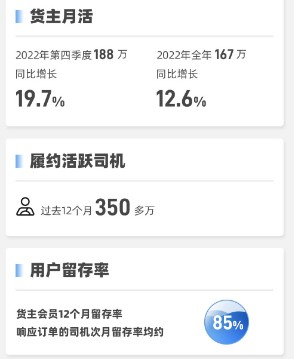 全年用户数据方面,财报显示,2022年平均发货货主月活达167万,同比增长12.6%;四季度平台货主月活增至188万,同比增长19.7%。过去12个月的履约活跃司机数达到350多万,平台的用户继续保持了高粘性的特点。
