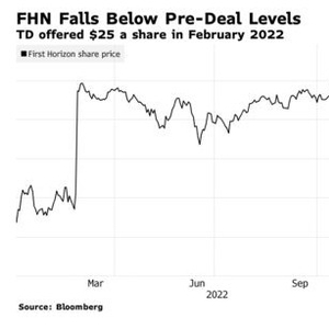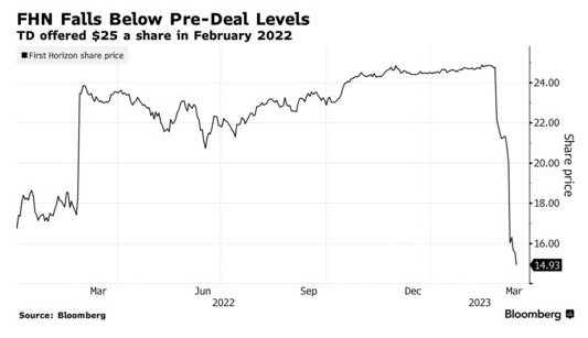 多伦多道明银行(TD.US)首席执行官曾在本月表示,该行将“完全致力于”以134亿美元收购第一地平线国家银行(FHN.US),但市场似乎并不买账。由于恐惧和不确定性在美国银行业蔓延,第一地平线国家银行股价上周暴跌26%。以上周五14.93美元的收盘价计算,该股较收购报价低了40%,有关多伦多道明银行要么试图重新谈判交易条款,要么放弃交易的呼声也越来越高。