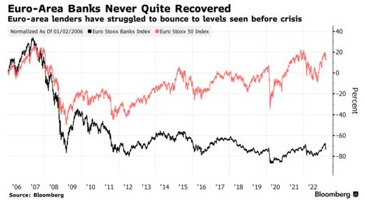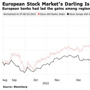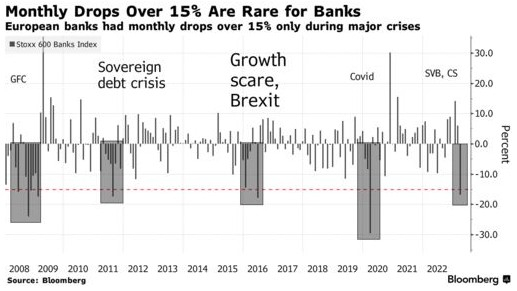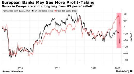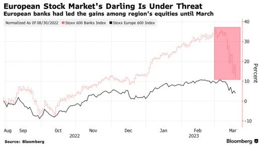 瑞信(CS.US)迅速出售给瑞银集团(UBS.US),以及该公司风险最高的AT1债券被抛售,对今年最受欢迎的欧洲股市交易,以及该地区的整体投资情绪构成了重大风险。本来在银行业危机出现前,欧洲银行股在经历了多年的低迷之后,终于开始押注它们是利率上升的主要赢家,但瑞信的突然危机导致其被瑞银收购,对投资者来说,不仅在该地区的银行,而且在金融权重最大的更广泛的地区股票市场中,警钟敲响了。