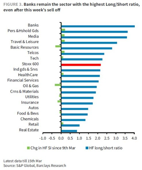巴克莱银行的数据显示,尽管本月出现大幅下跌,但欧盟银行股的仓位并未显著下降,银行业仍然是欧洲Stoxx 600 指数中多空比最高的行业,而大多数只做多的投资者目前仍坚持增持。报告表明银行股仓位方面的风险平衡是偏向下行的。