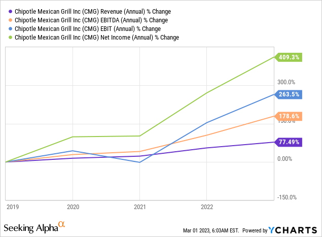 2022年,在美国整个快速休闲餐厅市场中Chipotle销售额为86.35亿美元,占据10.9%的市场份额。在过去五年中Chipotle表现出强劲的运营业绩,平均收入增长34%,运营利润增长91%,平均净收入增长175%。