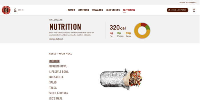 针对顾客的健康需求,Chipotle专门推出Keto Salad Bowl、Paleo Salad Bowl、High Protein Bowl等系列,分别对应不同时期健身人士的不同需求。此外,在点单页面中Chipotle也会贴心的为食客注明每种食物热量和营养价值,即使是减肥小白也可以实现膳食均衡的自由搭配。