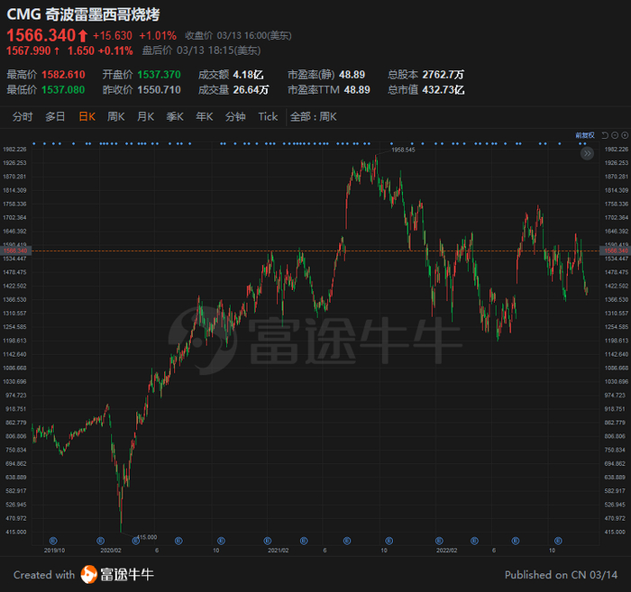 在股价方面,虽然同样经历了美国疫情肆虐时期的迫害,但Chipotle从2020年415.0美元/股的价格低点至截止2023年的3月14日收盘后的1566.34美元/股已经实现了超70%的反弹。