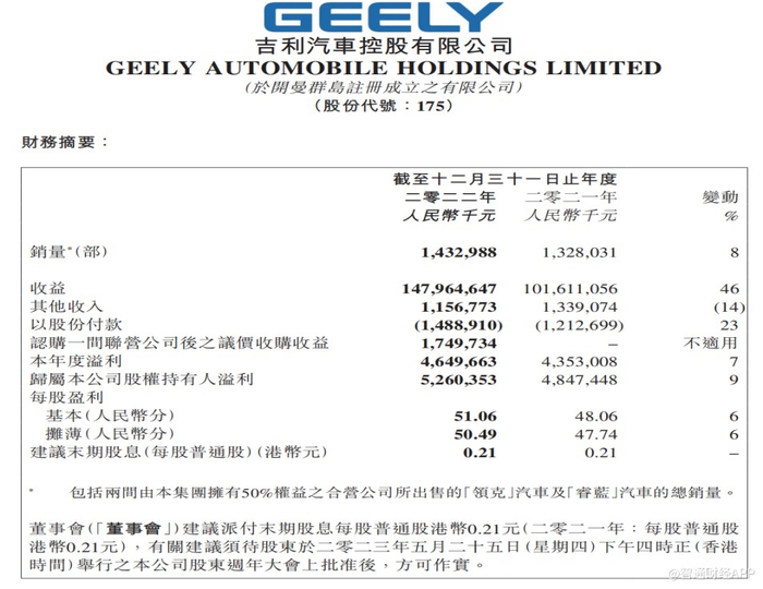 3月21日,吉利汽车(00175)发布2022年业绩公告。财报显示,集团实现收入达1479.65亿元(人民币,下同),同比增长45.62%;净利润总额同比增加约7%至46.5亿元。扣除非控股股东权益后,归属股权持有人净溢利由2021的48.5亿元增长9%;总现金水平同比上升20.4%至337亿元,创历史新高,财务状况持续提升。