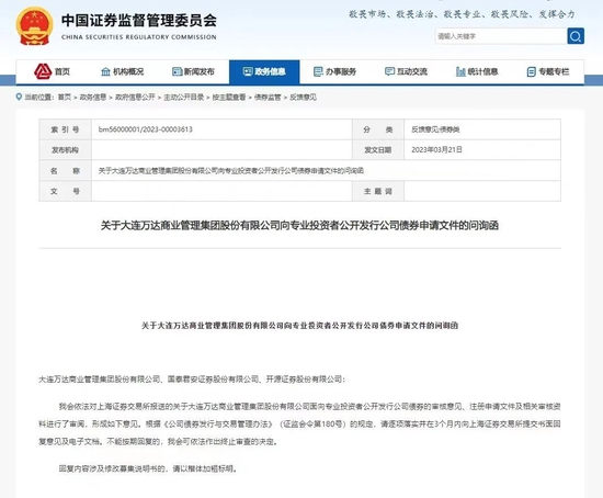 3月21日,证监会发布《关于大连万达商业管理集团股份有限公司向专业投资者公开发行公司债券申请文件的问询函》。