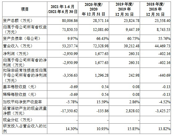 财务方面,于2019年度、2020年度、2021年1-6月,该公司实现营业收入分别为3.92亿元、7.23亿元、5.32亿元。同期,归属于母公司所有者的净利润分别为260.31万元、1677.63万元、-2950.99万元,呈现较大幅度的波动。